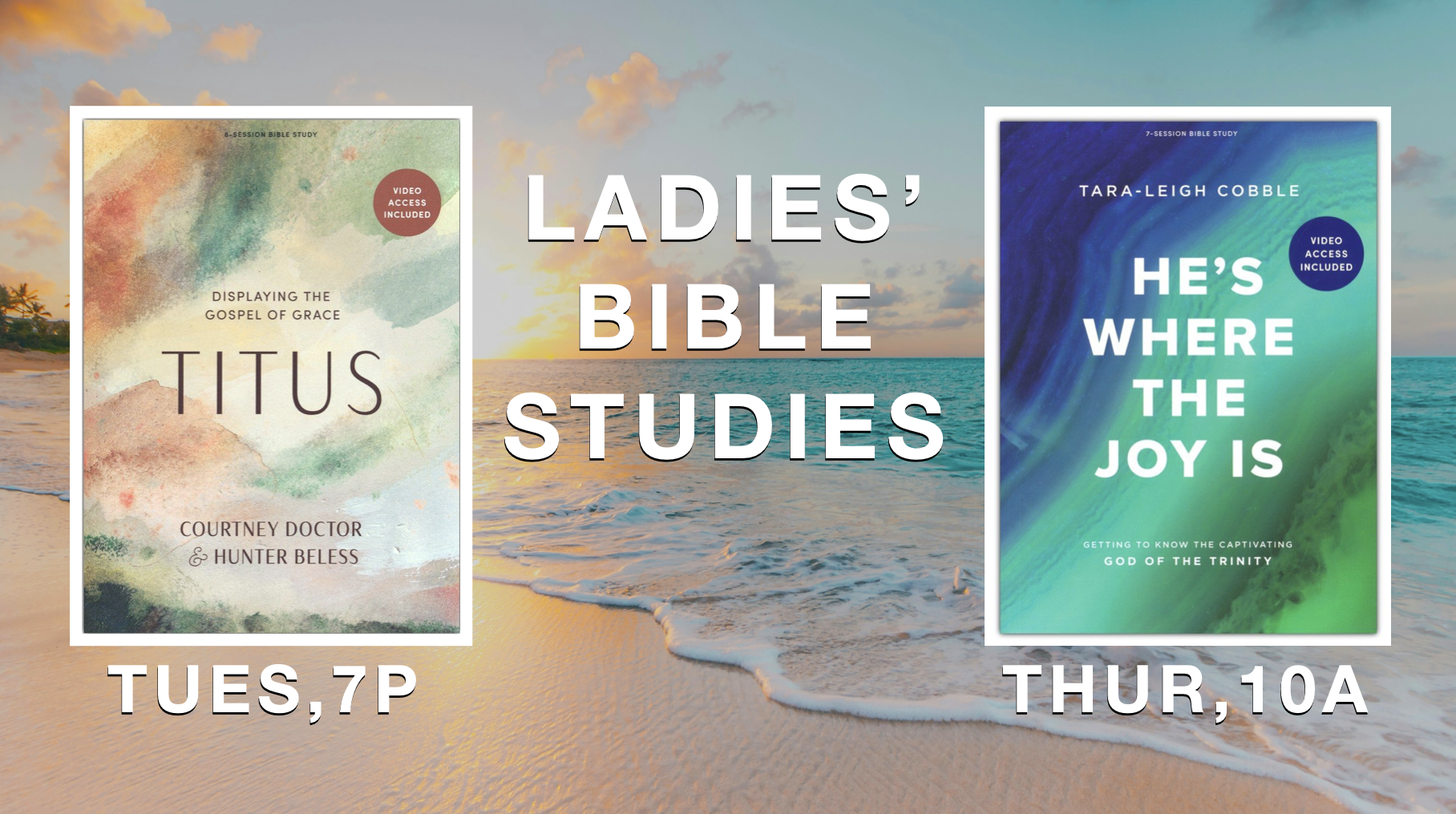 Our spring studies are up and running. Our Tuesday night study, Titus, by Courtney Doctor and Hunter Beless, meets at 7p. Our Thursday morning study is He’s Where the Joy Is, by Tara-Leigh Cobble and meets at 10a. These studies meet in the youth center and are open to all women and teen girls.